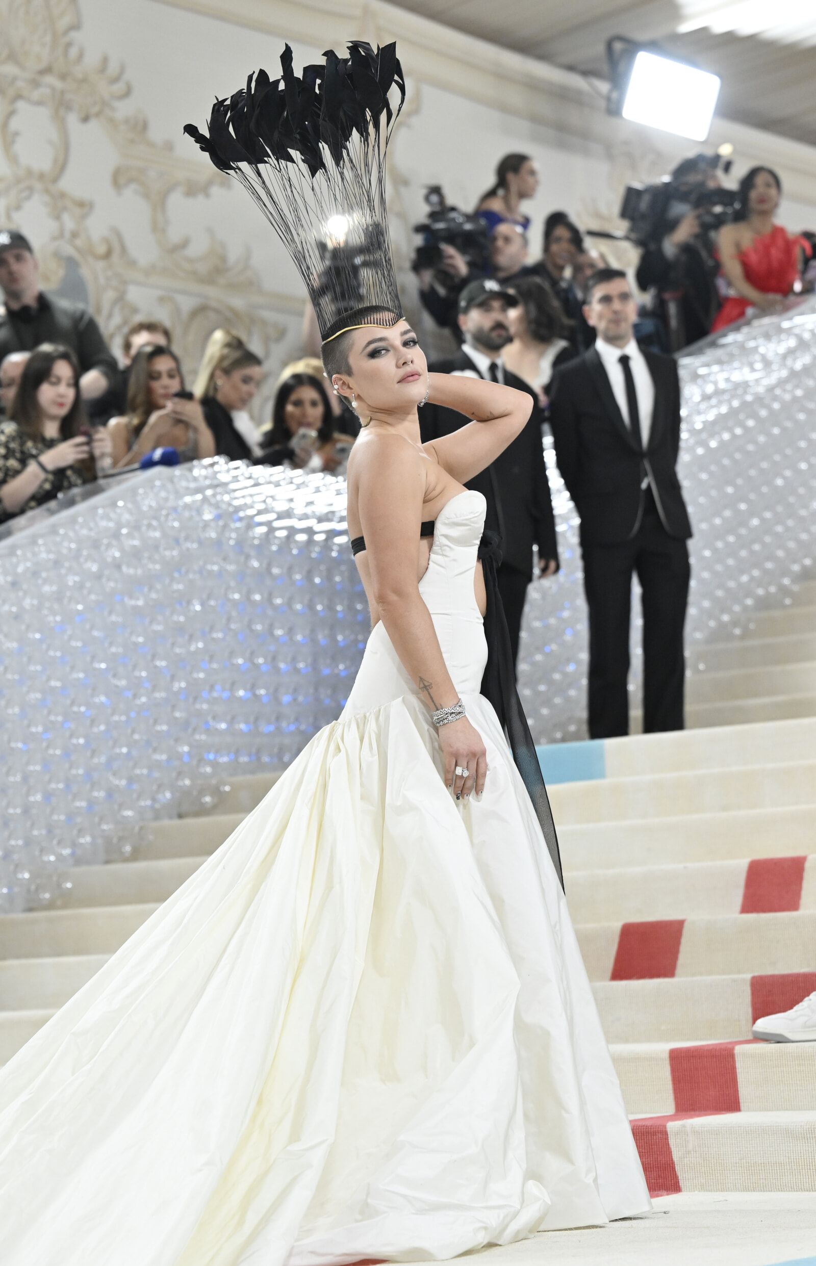 レッドカーペットで主張あるデザインの服を着ることで知られるフローレンス・ピューは、なんと坊主頭に! 黒いフェザーのヘッドドレスを被って、ロックなスタイルを披露。