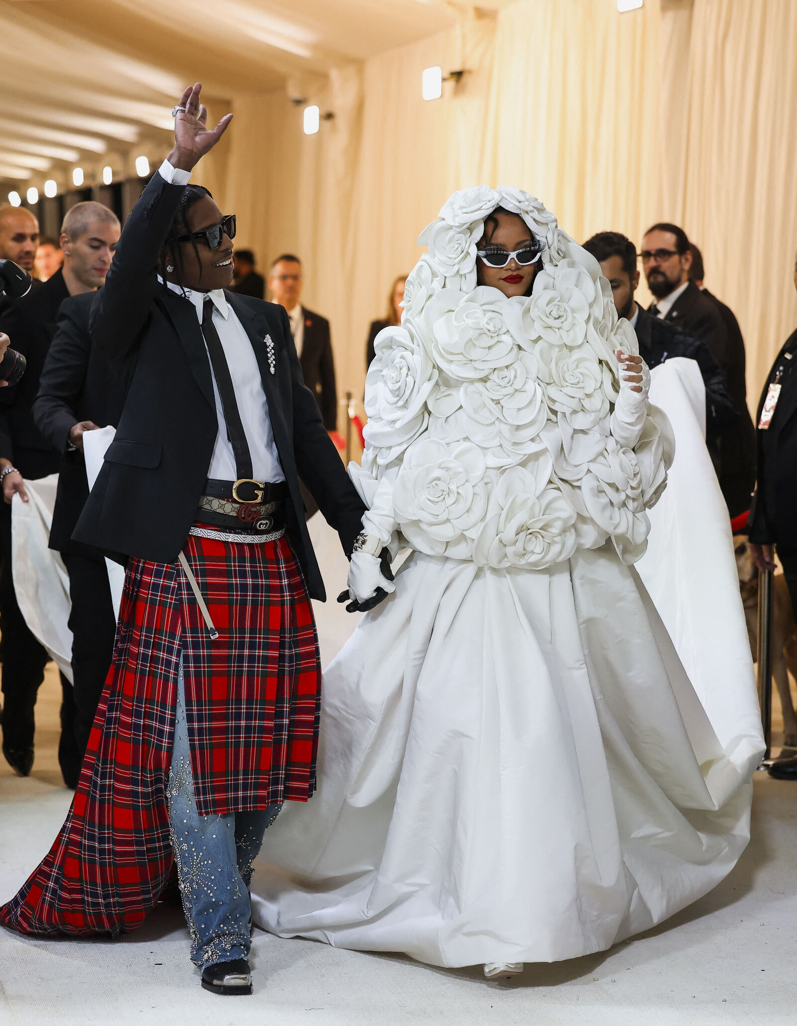 会場に遅れて現れ、ものすごい歓声を浴びていた、METガラの女王リアーナ。真っ白なフラワーがあしらわれたヴァレンティノのモコモコルックは、どこかで見覚えがあると思ったら、マトリョーシカ人形っぽくもある。パートナーのエイサップ・ロッキーはグッチを着用。最高にクールなカップル。