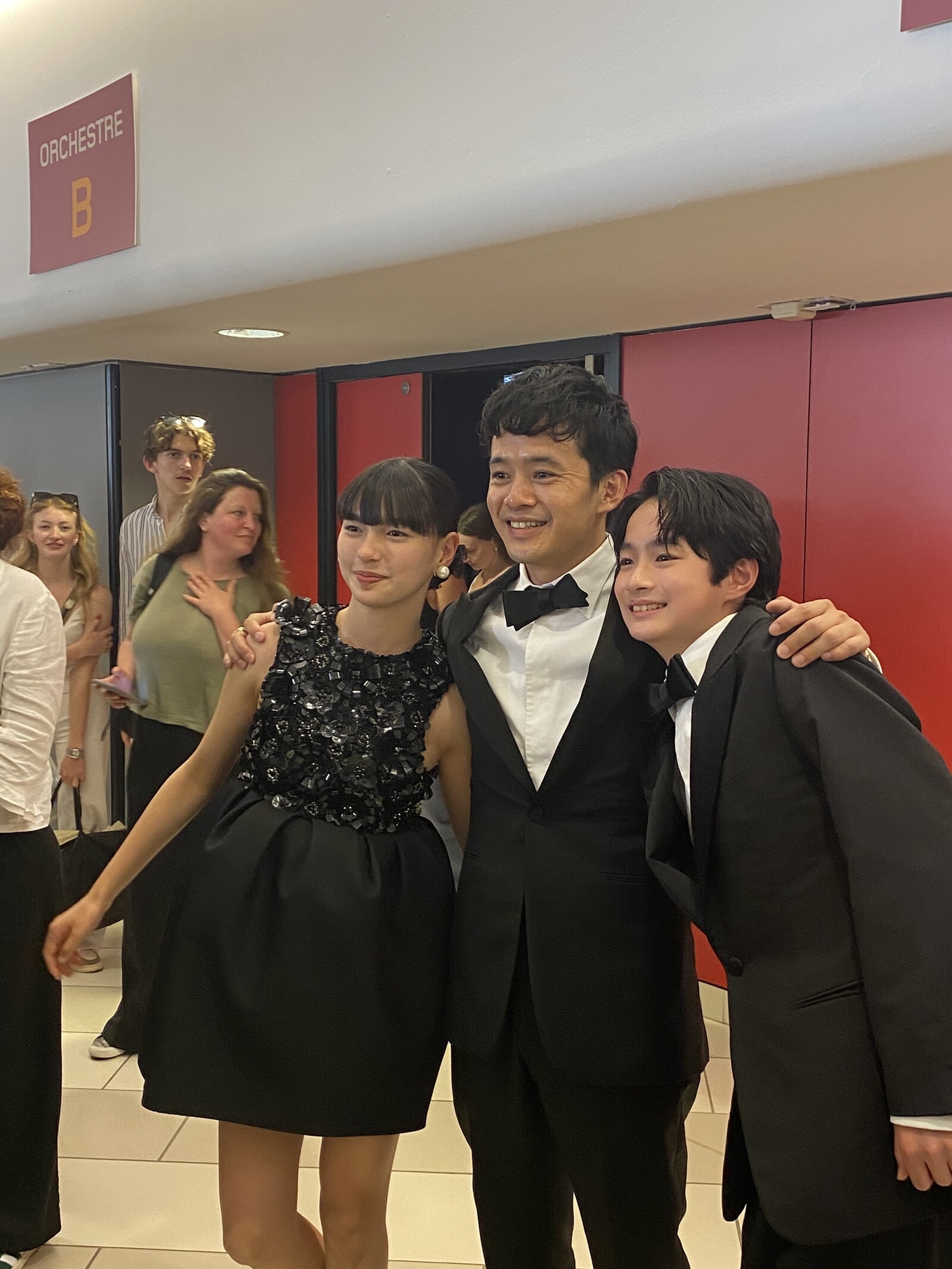 公式上映後の中西希亜良、池松壮亮、越山敬達をキャッチ。中西希亜良のドレスはセリーヌ。©︎Momoko Suzuki