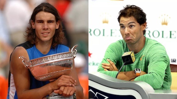 コートには立っても、薄毛で矢面に立つことはなかったラファエル・ナダル。(2006年、2016年) photo : Abaca