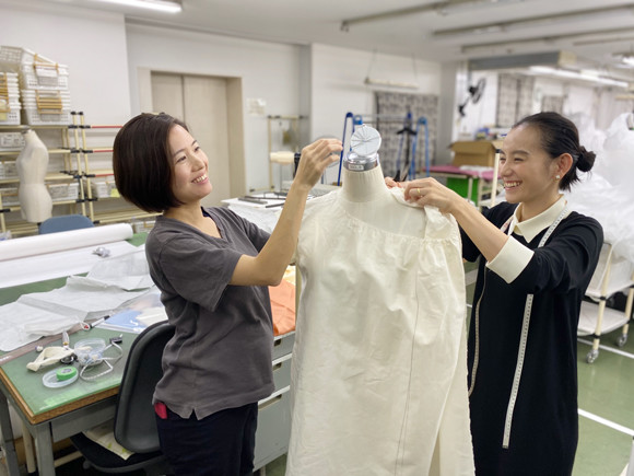 広告の衣装を作るのは初めてだったので、より完璧に仕上げたいという想いから、まずは自分で仮組みし、その後、デザイナーズブランドの縫製も手掛けている栃木県の衣服製造会社・都ドレスの松本聖子さんを訪ね、作品をブラッシュアップ。以前からお付き合いのある聖子さんは、パタンナーとしても活動されており、毎回的確なアドバイスをくださいます。私が縫ったトワルをチェックしていただき、またすべてほどいて、さらに平面のパターンで細かく直していく地道な作業を経て、理想の形へと近づけていきました。「せっかく縫ったのに……」と思いますが、大事なプロセスなんです。