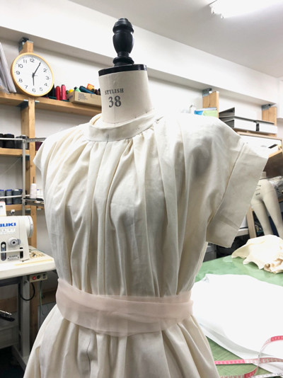 衣装を作るときにはシーチングという布地で仮製作をしてシルエットを作ってゆきます。ワンピースは襟元にこだわりました。タックを入れて布を折りたたみながらも、ギャザーを入れることでふんわりと柔らかな印象になるのです。撮影の絵コンテを見せていただき、トップスに印象が残るように心がけました。