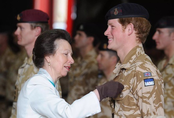 ブルーズ・アンド・ロイヤルズの騎兵連隊長として、コンバーミア兵舎で、アフガニスタンでの任務を終えた兵士たちの勲章授与式を執り行うアン王女。この中には、彼女の甥っ子であるハリー王子も含まれていた。(ウィンザー、2008年5月5日) photo : Getty Images