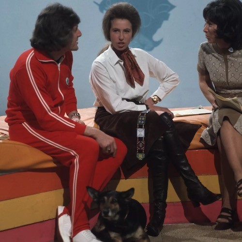1971年、子ども向け番組「ブルー・ピーター」でヴァレリー・シングルトンとピーター・パーヴィスのインタビューを受けるアン王女と愛犬のペトラ。 photo : Getty Images