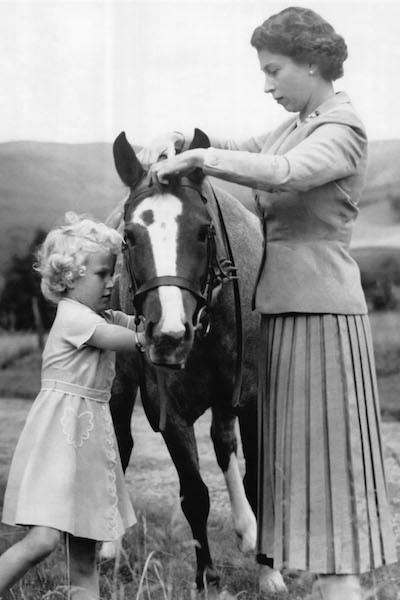 1955年8月、夏のバカンスを過ごしたバルモラル城の庭で、ポニーの手綱を調整する母エリザベス2世を手伝うアン王女。母の傍らで乗馬の楽しさを覚え、その後も乗馬に対する情熱の火が消えることはなかった。 photo : Getty Images
