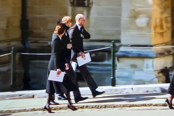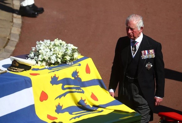 1. 父、フィリップ王配の葬儀で棺につき添うチャールズ皇太子。(ウィンザー城、2021年4月17日)photo : PA photo / Abaca