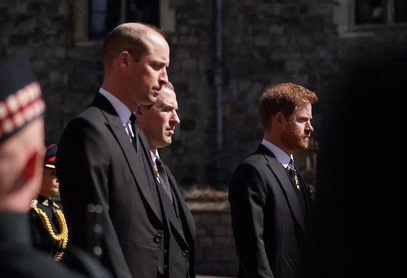 5. ウィリアム王子とハリー王子、間にいとこのピーター・フィリップスを挟んで。(ウィンザー城、2021年4月17日) photo : PA photo / Abaca