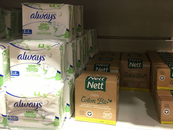 店頭に並ぶオーガニック素材を使った生理用品。パッケージには「Bio」や「ORGANIC」の文字が。 photo : Rebecca Zissmann