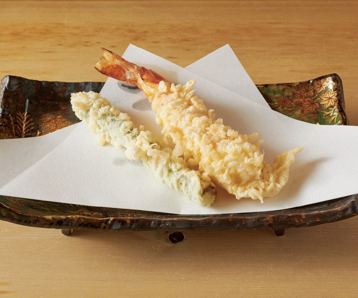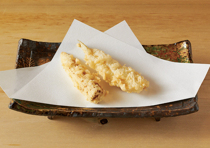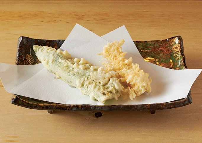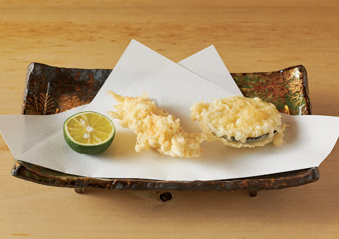 たとえば、多様な野菜揚げ。江戸前の基本は魚介だが、ここではかなり早い時期から野菜を組み込んでいた。軽さが出て、当時から大好評だったという。さらに進化し、いまでは、魚介と野菜を一種類ずつ組み合わせ、ひと皿にして出すというスタイルを確立した。江戸前天ぷらでは馴染みのない、アジやイワシ、サンマといった光り物を揚げるのも面白い試みだ。