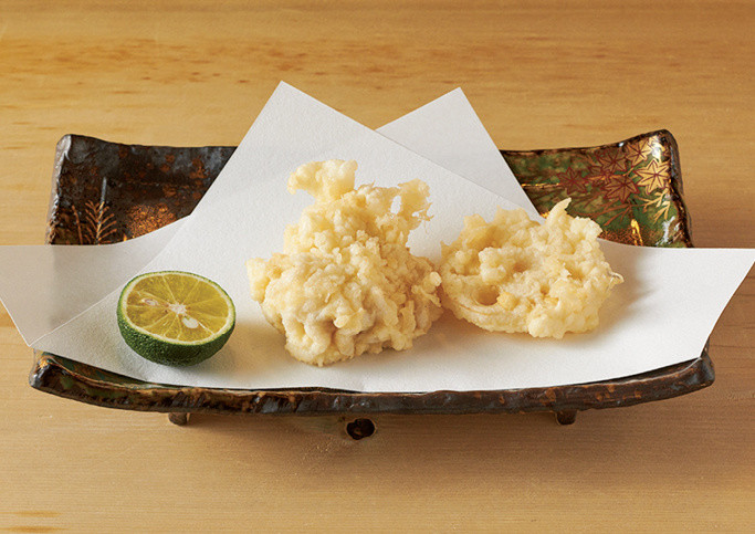 寒い季節のお楽しみ、サクッとした衣の中にはとろける鱈の白子が。一緒に出た歯ごたえあるレンコンとの対比も面白い。