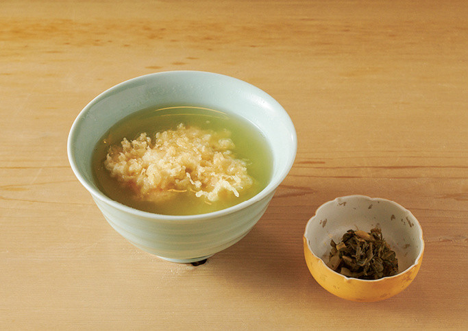 海老のかき揚げに煎茶を注ぎ、ワサビと塩でコクを引き出した天茶のレシピは、映画監督の小津安二郎が提案したもの。