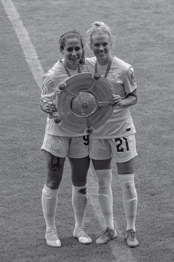 アンナ・ブレッセ(写真左):1987年、旧東ドイツ生まれ。ディフェンダー。2004年、U-19ドイツ代表で優勝。現チームで13、14年チャンピオンズリーグも優勝している。instagram:@anna_blaesse9 ララ・ディッケンマン(写真右):85年、スイス生まれ。ミッドフィルダー。02年からスイス代表、オハイオ州立大学で政治学を学ぶ。15年から現チーム。instagram:@ld_21