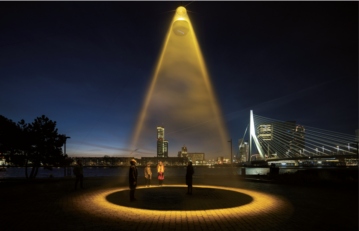 これは、人の皮膚や目にはダメージを与えずに新型コロナウイルスやインフルエンザウイルスを消滅させる、波長222ナノメートルの紫外線を照射する照明装置。この紫外線を使ったウイルス不活性化技術は既に屋内用で実用化が進んでいるが、ロースガールデは、これを屋外で大規模に使用しようと考えた。この光の下では、人々が再び安心して集えるというわけだ。