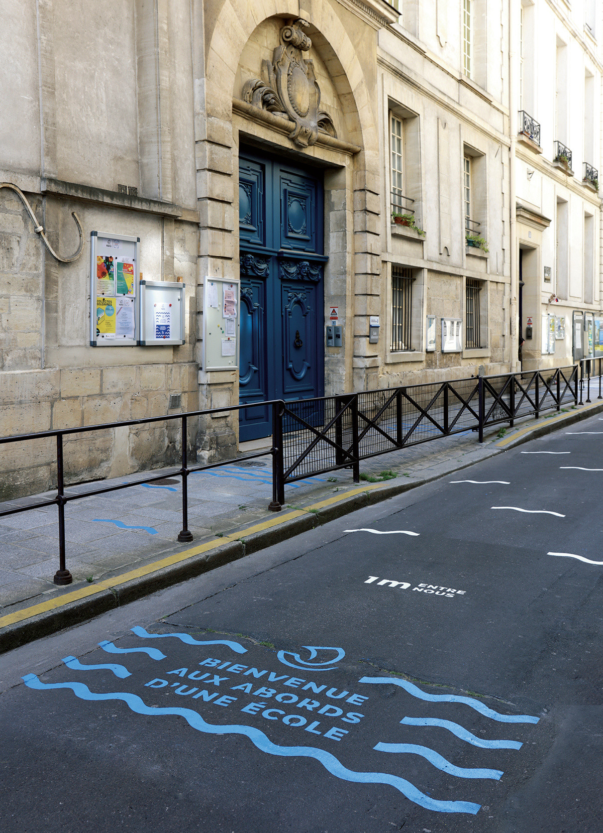 昨年5月、4区の小学校の正門前に登場した白とブルーの波。ブルーは、登校する子どもたちが並ぶ場所。白は、送り迎えの保護者用。学校のある歩行者専用道路の入り口には、パリ市の紋章の帆船とともに「学校のあるエリアへようこそ」と書かれている。