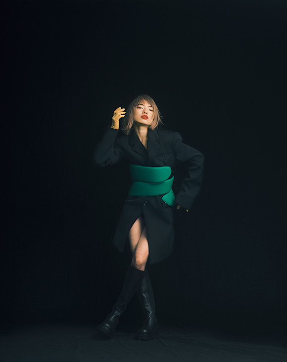 彼女の遊び心を滲ませる、身体に巻き付くようなコルセットベルト。インコから着想を得たパラキートグリーンも目を引く。ボディラインをグラフィカルに演出するコートは、ストレッチの利いたキャバルリーウール製。コンバットテイストのロングブーツで、芯のある女性像を感じさせて。