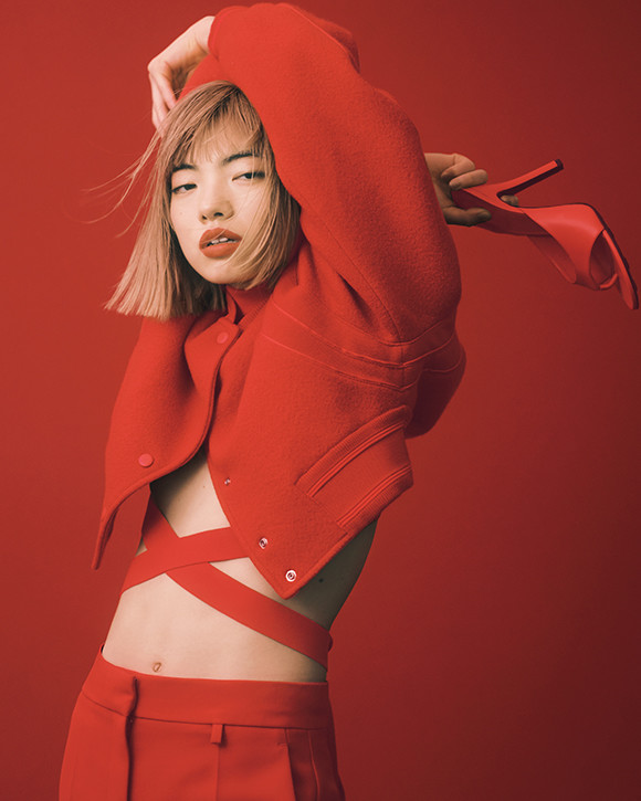 ビビッドな赤でまとめたスタイルが、彼女の色を際立たせる。スリーブにボリュームのあるクロップト丈のボンバージャケットの中には、ニットハーネスを合わせてコントラストを鮮明に。レザーのピンヒールを合わせれば、挑戦的なムードも漂う。