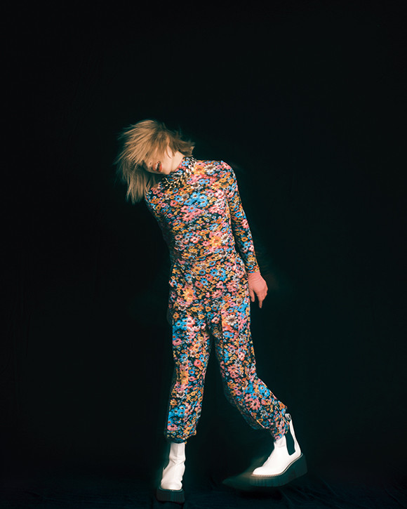 力強く咲く花々のプリントには、未来へのポジティブなメッセージが込められている。ストレッチ素材のトップとシルクパンツは、どちらも軽やかな着心地。アイコンバッグの「ファラベラ」のチェーンは新たにネックレスとなり、装いのアクセントに。