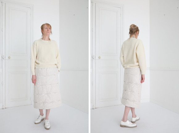 オールホワイトのルックを秋冬に纏う清々しさ。ニット「ケイト」¥112,300、中綿入りのスカート「シュゼット」¥140,500(ともに予定価格)/ともにエコール・ド・キュリオジテ
