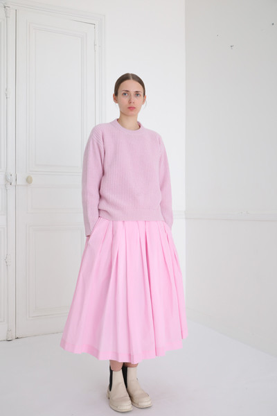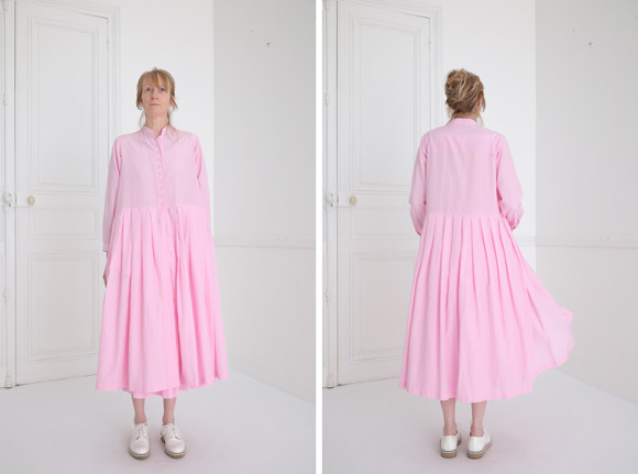 伊藤 はい、今シーズンに関してはそうですね。普段なら、テーマとするアーティストの作品の要素をストレートに用いることはあまりしません。でも、今回はマハさんが所有しているルーシー作の器の実物を実際に触らせてもらったこともあり、その際に抱いたエモーショナルな部分を服に落とし込みました。ただ、それも作品のピンクだけではなく、生活のさまざまなところから取材して、理想の色彩に近づけていきましたね。“70年代に建設された、パリの地下鉄のナシオン駅の天井のピンク”とか……。マニアックに聞こえるかもしれませんが、それくらい本当にいろんなところから探しています(笑)。