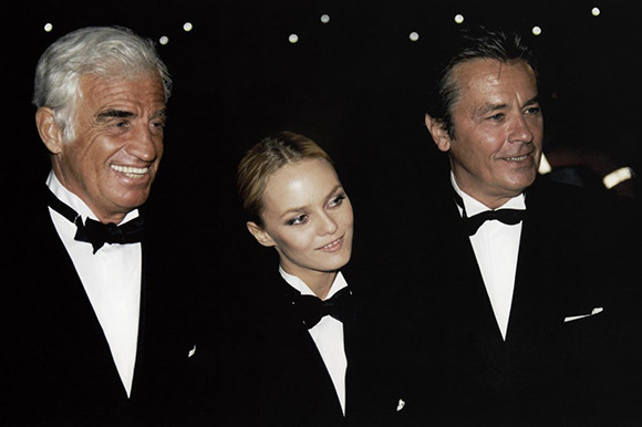 映画『ハーフ・ア・チャンス』でおそろいのディナージャケットを纏ったジャン=ポール・ベルモンド、ヴァネッサ・パラディ、アラン・ドロン。(1997年)