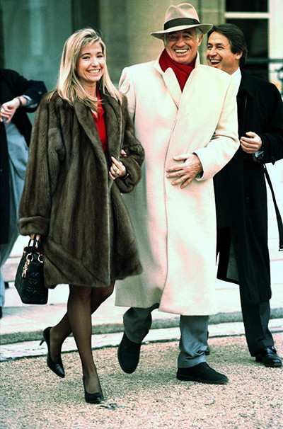 ジョニー・アリディのレジオンドヌール勲章の受賞式を後にするクリーム色のコート、赤いマフラー、リラックスジーンズを纏ったベルモンドと妻のナッティ・タルディヴェル。(1997年1月24日)