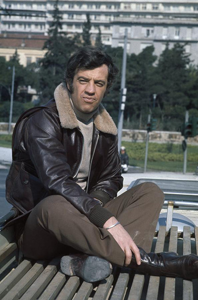 映画『華麗なる大泥棒』で、トレードマークの一つであるレザージャケットを着たジャン=ポール・ベルモンド。(1971年)