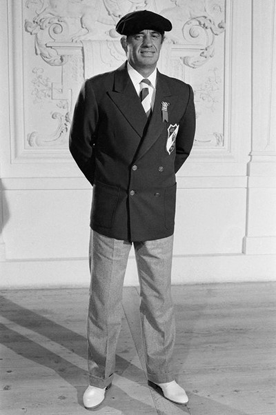 『エース中のエース』の撮影現場で、いかにもフレンチのベレー帽とダブルジャケットを纏ったベルモンド。(ミュンヘン、1982年)