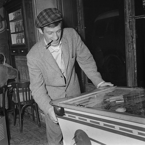 たばこを加えて、ピンボールに興じるベルモンド。(1962年)