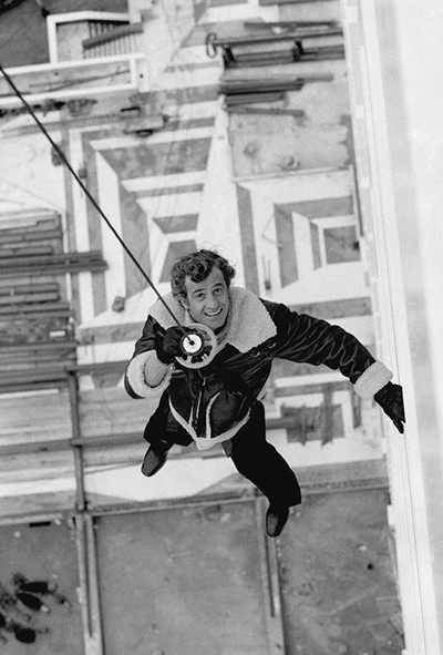 『恐怖に襲われた街』の撮影で、レザージャケット姿でヘリコプターにつられるベルモンド。(1974年)