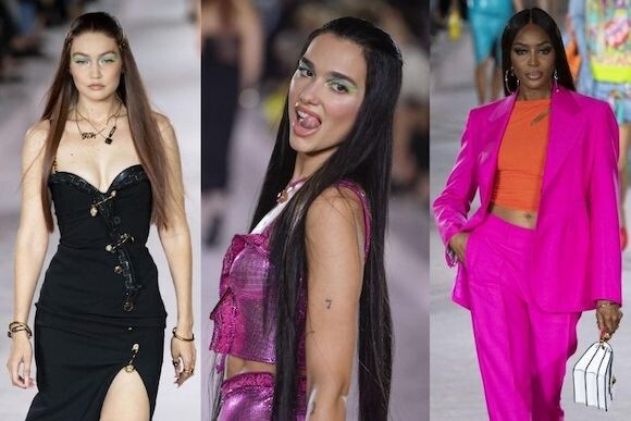 ヴェルサーチェのキャットウォークに登場した(左から)ジジ・ハディッド、デュア・リパ、ナオミ・キャンベル。 photos : Abaca