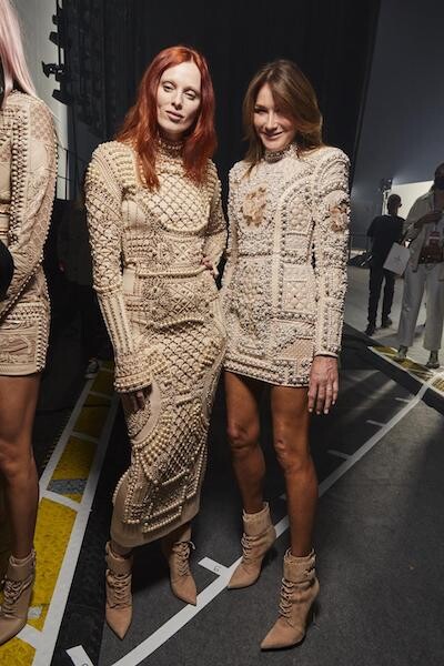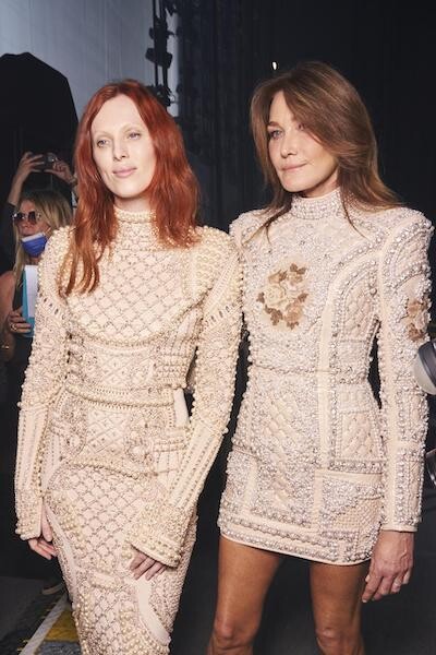 7. カルラ・ブルーニとカレン・エルソンは、バルマンのファッションショーのためにセーヌ・ミュジカーレの舞台裏にいた。(パリ、2021年9月29日)