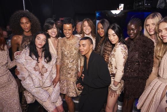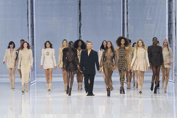 8. バルマンのショーのフィナーレを飾ったオリヴィエ・ルスタンとスーパーモデルたち。(パリ、2021年9月29日)