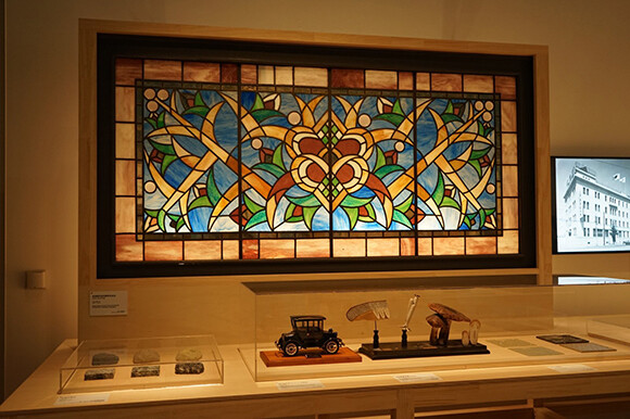 『京都市京セラ美術館開館1周年記念展 モダン建築の京都』の展示風景。Section1「古都の再生と近代」の島津製作所河原町旧本社(現フォーチュンガーデン京都)のコーナーではステンドグラスや大理石標本などを展示。