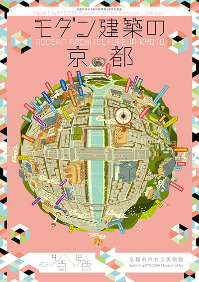 展覧会のメインビジュアルを手がけたのは、瑞泉寺の和尚でイラストレーターの中川学。「大正の広重」と呼ばれ、独特の鳥瞰図を数多く描いた吉田初三郎が、京都のモダン建築を描いたらどうなるかという視点から作成。アートディレクションはおおうちおさむ。
