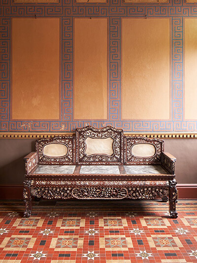 長楽館(旧村井吉兵衛京都別邸)の螺鈿細工のイスも展示。長楽館の外に持ち出されるのは初めてのこと。大正時代以前 H1050×W1830×D650mm 所蔵:長楽館 撮影:三吉史高