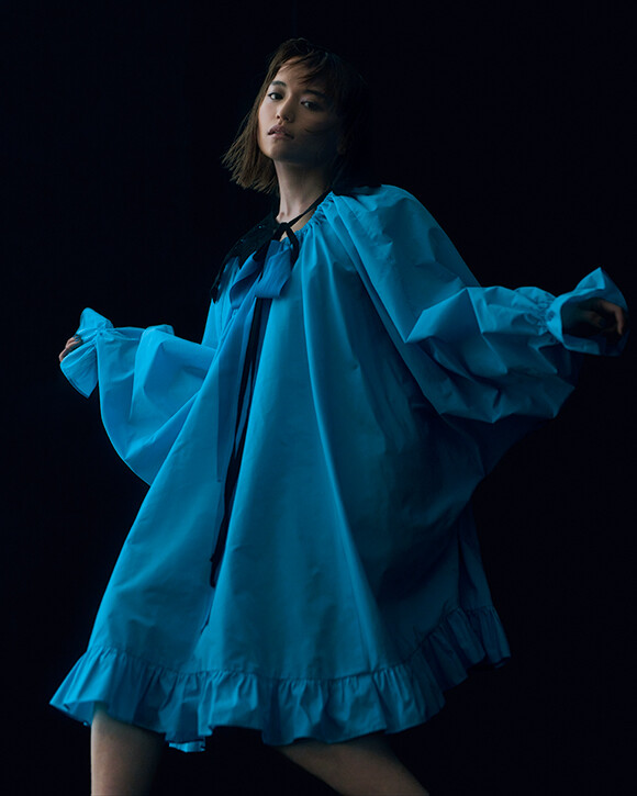大きく広げた手足が際立たせる、抜群のボリュームが絵になるドレス。首元の長いリボンをぎゅっと結び、ふんだんにギャザーを寄せて。リサイクルファブリックで作られたと知れば、好奇心も増す。繊細なレースで仕立てられたブラックの付け襟が、ドレスをさらにロマンティックに見せる。