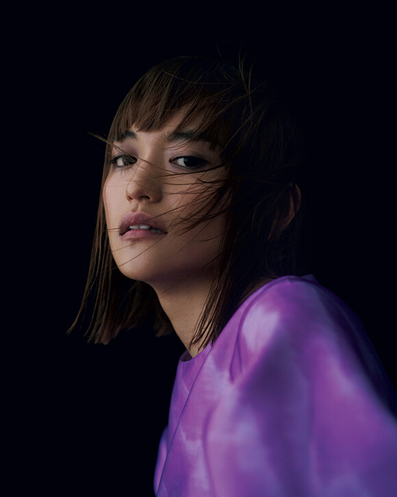 大きく膨らむパフスリーブがユニークなシルエットを生み出すミニドレス。微光沢のパープルのファブリックに、モアレのプリントがぼんやり白く滲む。暗闇を明るく照らすイメージでつくられたという一着が、儚くも強い彼女の眼差しとシンクロする。