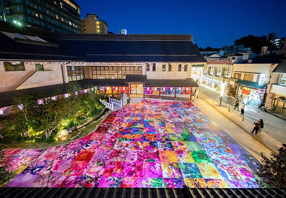 道後温泉別館 飛鳥乃湯泉中庭の「ハダカヒロバ」に、蜷川実花による約230点の花の写真を設置。彼女にとって初となる、屋外の床面にも写真を用いた大規模なインスタレーションだ。