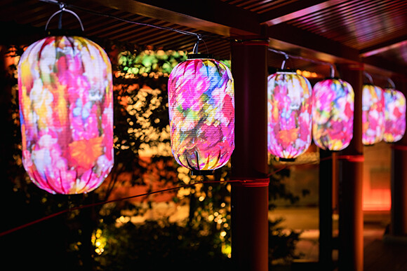 蜷川実花のインスタレーションは、2種類のオリジナル提灯で広場を装飾し、昼夜で異なる雰囲気を楽しめる。「またこうして、道後温泉と取り組むことができて嬉しいです。今回は、屋外に作品を展示するということで、花の写真の広場を作ってみました。私自身、花の持つ力に支えられてきましたし、ひどく落ち込んでしまうようなことに直面した時に花を撮ることで、己を保てているな、と感じることが何度もありました。先の見えない、不安なことも多い世の中ですが、見てくれた人の背中を少しでも押すことができたら、こんなに嬉しいことはありません」と蜷川もコメントを寄せる。