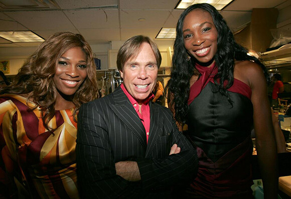 姉妹がテニスの次に愛するのはファッション。ラジオシティ・ミュージック・ホールで開催されたファッション・ロックス・タレント・ギフト・ラウンジで、デザイナーのトミー・ヒルフィガーとポーズを取るふたり。(ニューヨーク、2004年)