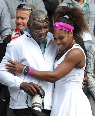 セリーナ・ウィリアムズのキャリアと人生のなかで重要な位置を占める父のリチャード。セリーナの試合にはほぼ必ず足を運ぶ。写真は2012年ウィンブルドン選手権12日目に行われた女子シングル決勝戦で、アグニエシュカ・ラドワンスカと対戦したとき。(ロンドン、2012年)