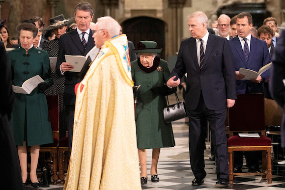 エプスタイン事件への関与を疑われて失脚したアンドルー王子の腕につかまり、杖をつきながら会場に到着したエリザベス女王は40分のミサの間立ち続け、涙を流した。