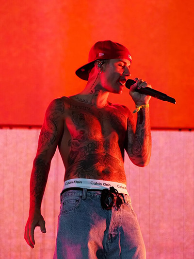 コーチェラ・フェスティバルのステージで、カルバン・クラインの下着がチラ見えのミスター・カルバン・クライン(ジャスティン・ビーバー)。(カリフォルニア州、2022年4月15日)