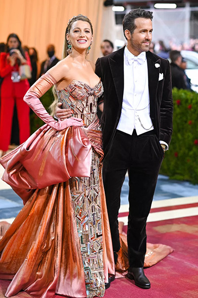 メットガラ2022にヴェルサーチを着たブレイク・ライブリーとラルフローレンを着たライアン・レイノルズが登場。(ニューヨーク、5月2日)