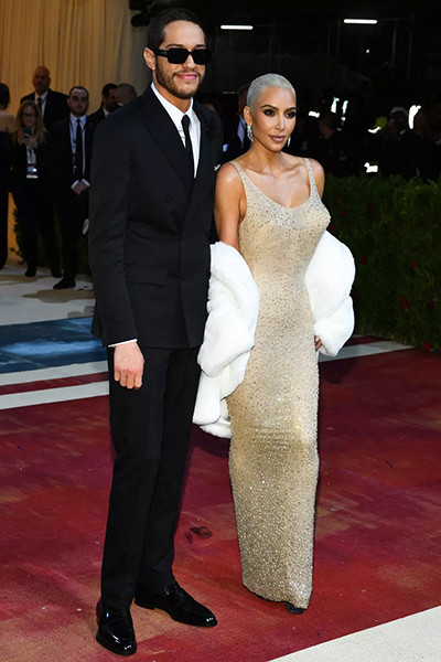 マリリン・モンローのヴィンテージドレスを着たキム・カーダシアンとディオールを着たピート・デヴィッドソンが、メットガラ2022に登場。(ニューヨーク、5月2日)