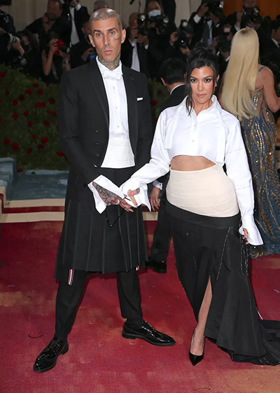 メットガラ2022でトム・ブラウンを着たコートニー・カーダシアンとトラヴィス・バーカー。(ニューヨーク、5月2日)