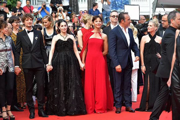 サンローランのアンソニー・ヴァカレロによるルックを纏ったニール・シュネデール、ルイ・ヴィトンを纏ったジュリア・デュクルノー、アミラ・カサール、ショパールのジュエリーを身に着けたソフィー・マルソー、ニコラス・ウィンディング・レフン、ベルルッティのルックのジャン・デュジャルダンメラニー・ロラン。(カンヌ、2022年5月24日)