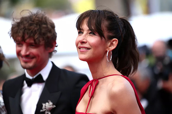 サンローランのアンソニー・ヴァカレロによるルックを纏ったニール・シュネデールとショパールのジュエリーを身に着けたソフィ・マルソー。(カンヌ、2022年5月24日)
