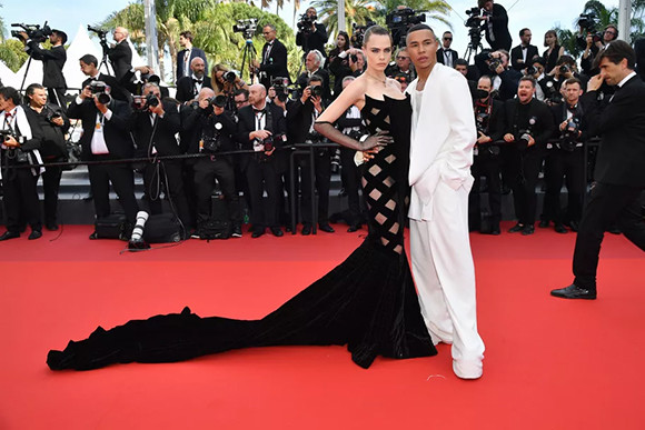 バルマンのドレスを纏ったカーラ・デルヴィーニュとオリヴィエ・ルスタン。(カンヌ、2022年5月24日)