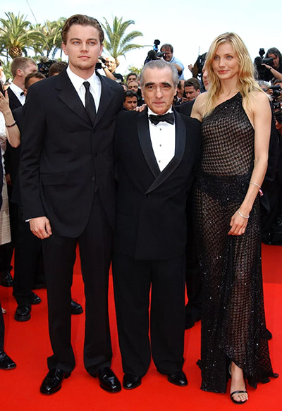 レオナルド・ディカプリオと並び、キャメロン・ディアスはデコルテラインがきらめくアシメントリーなシースルードレスで。(カンヌ、2002年5月)
